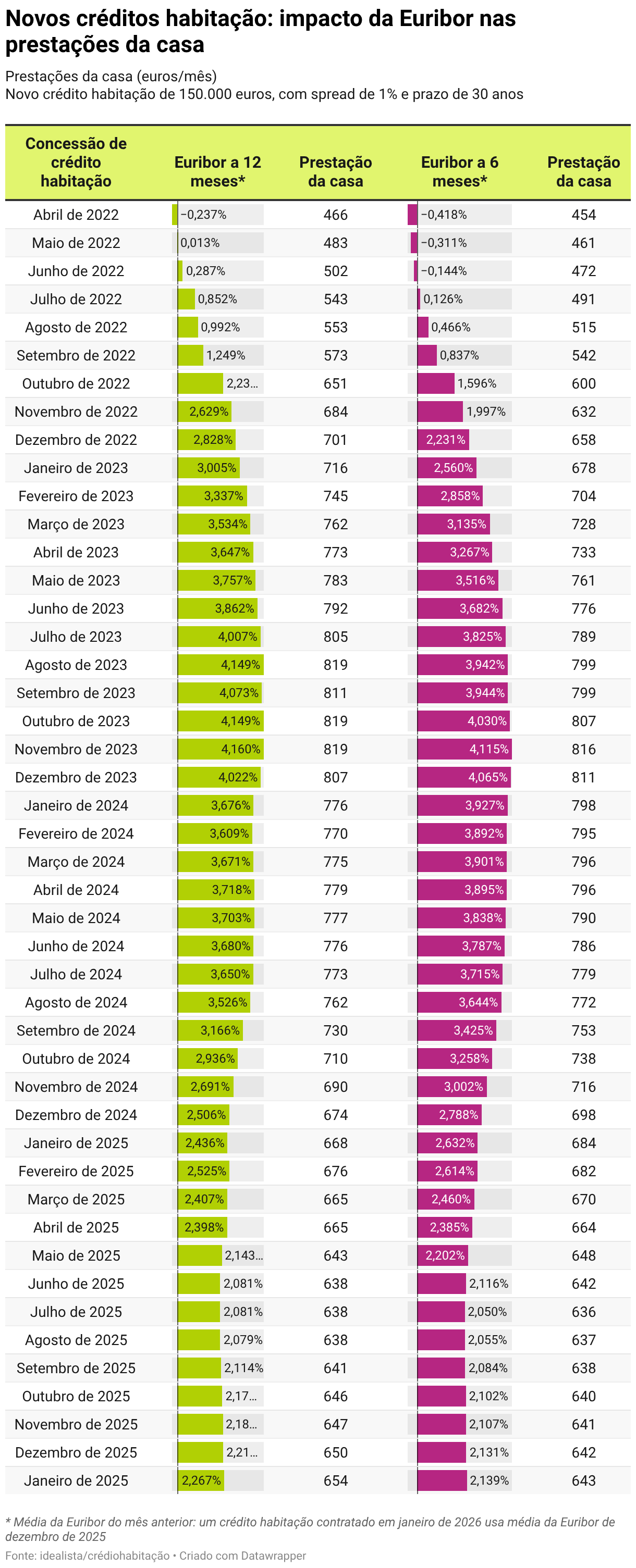 - Euribor a 12 meses: a prestação da casa será de 654 euros nos doze meses começados em janeiro de 2026, mais quatro euros face a um empréstimo contratado em dezembro de 2025;