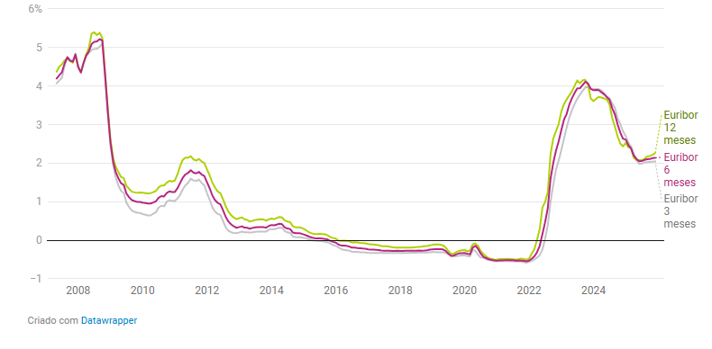 Em dezembro não foi diferente. Uma vez mais, Euribor subiu para todos os prazos, ainda que ligeiramente, deixando as taxas médias mensais nos seguintes valores no último mês de 2025: